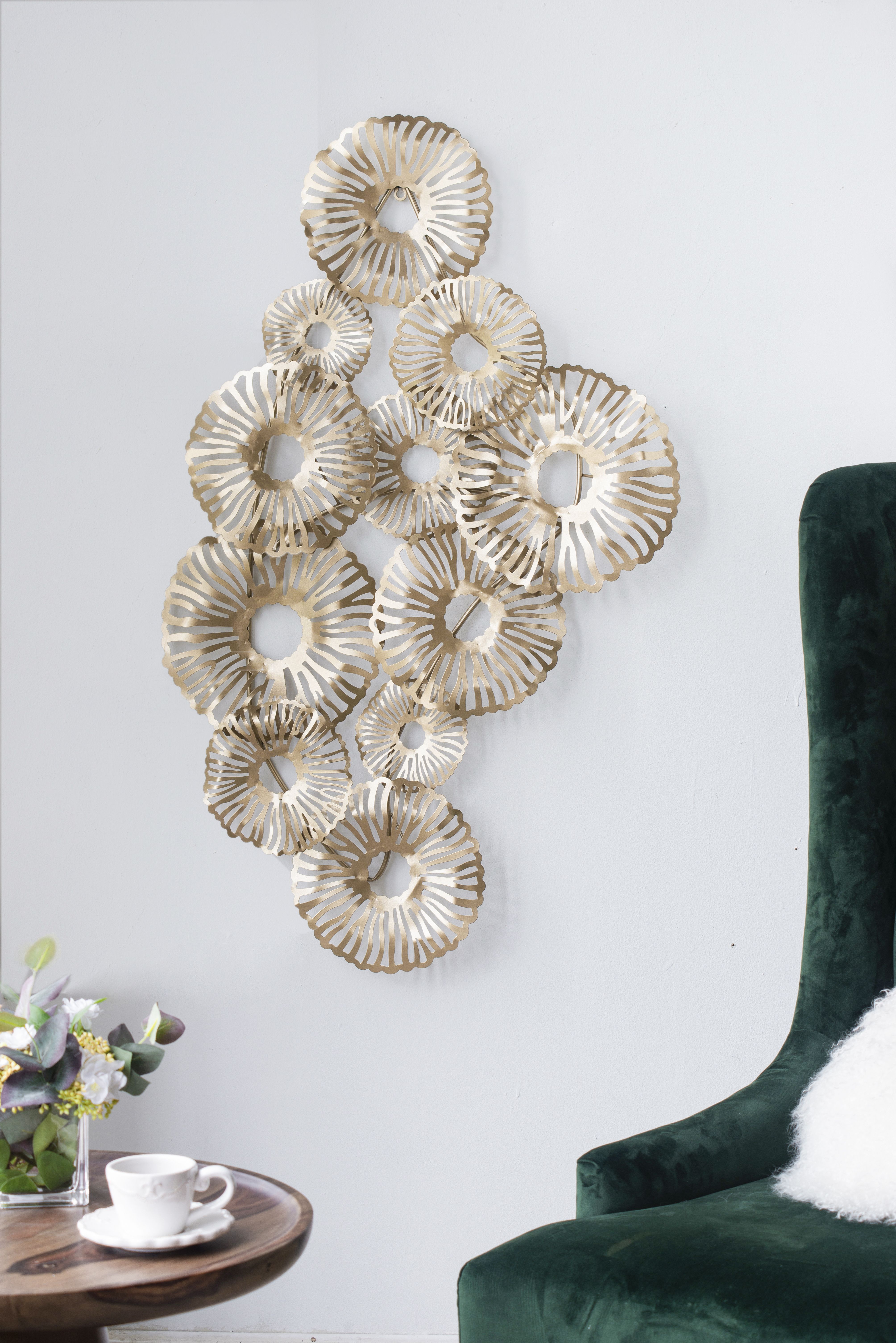 With its luminous gold finish,modern design,and impressive size,this dynamic wall art adds a bold look that echoes the look of coral.Perfect for a modern office,beachy sunroom,or chic living room,this piece complements a variety of styles with its open,circular shape and lavish shine.Durably constructed of 100% iron,this delicate-looking piece offers glamorous style for years to come.