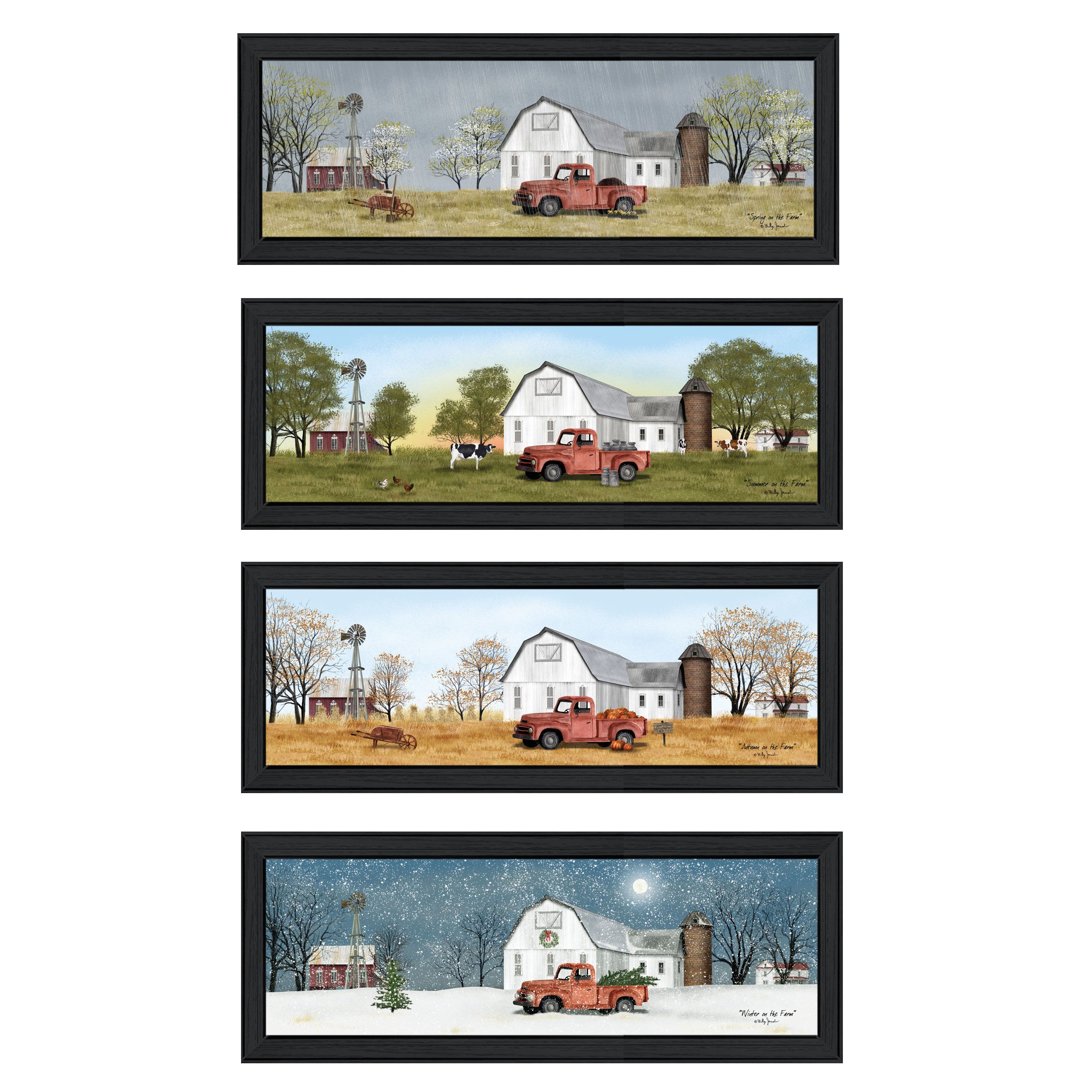 V629-405 "Billy Jacobs Four Seasons Collection VII" Vignette. This newer large size collection is finally available, All Four Seasons in matching (4-39" x 15") white frames: BJ1196A-Spring, BJ1198A-Summer, BJ1191B-Autumn and BJ1194A-Winter. All four artworks feature the same farm scene, pictured in each of the four seasons. The focal point is a mid 50s rusty red pickup truck in front of a large white barn with brick silo attached. The background on either side shows a white clapboard farm house, a red barn, windmill, and a variety of trees. This framed art is totally American made. The surface of the art is coated with a fade resistant texture which gives it a canvas-like appearance. No glass is necessary. Arrives ready to hang. •Print has fade resistant surface texture, no glass is necessary•Woman Owned Busines (WBE)•Arrives ready to hang, no additional hardware needed on item•individually hand crafted by skilled American workers•Decorative grouping in matching frames