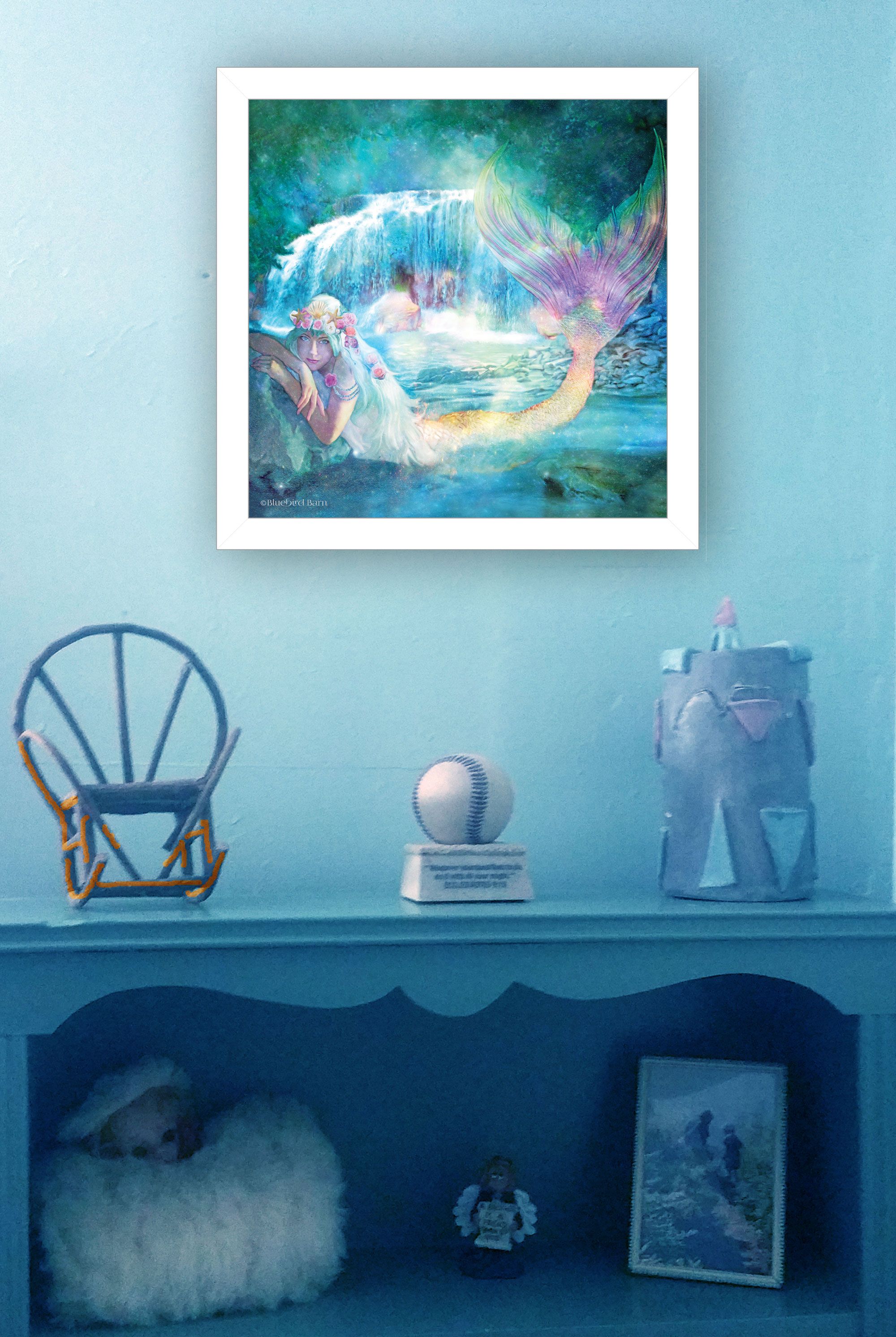 Blue129-779W "Woodland Cove Mermaid" by artisan Bluebird Barn. This decorative white framed print (14x14) of a mermaid in teal/blue water blended with a beautiful color of purples. This framed art is totally American made. The surface of the art is coated with a fade resistant texture which gives it a canvas-like appearance. No glass is necessary. Arrives ready to hang. To view a 2-piece vignette, including this print, please search: V591-779W•Print has fade resistant surface texture, no glass is necessary•Woman Owned Busines (WBE)•Arrives ready to hang, no additional hardware needed on item•individually hand crafted by skilled American workers•frame mitered with precision equipment•Framed art with no glass for safety around children