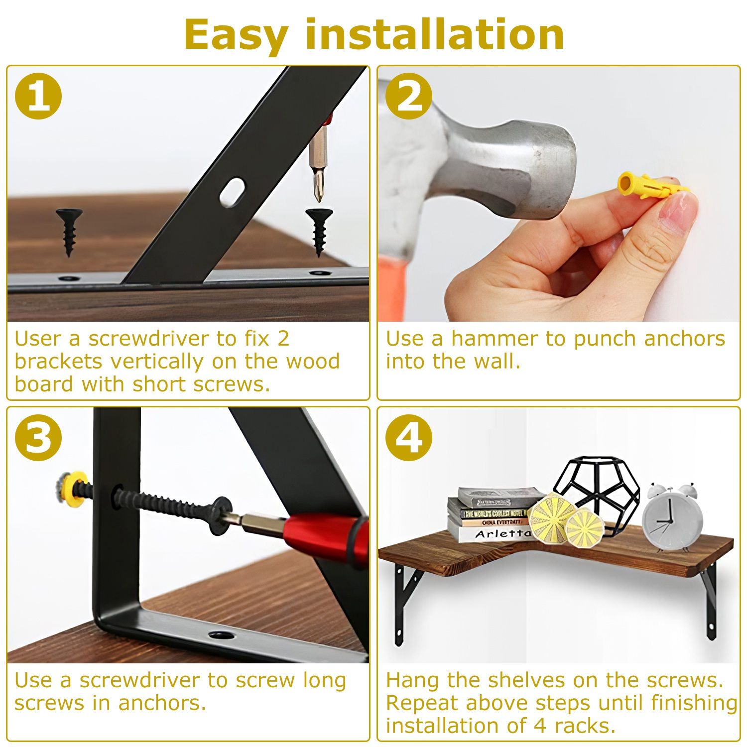 Multifunctional Storage Shelves: Come with 4 packs shelves, perfect displaying a wide range of collectibles, potted plants, photo frames, books, and etc.. You can also install it in your bathroom or kitchen to store your toiletries, cosmetics or condiments neatly. Suitable for bedroom, living room, bathroom, store, office, and etc..