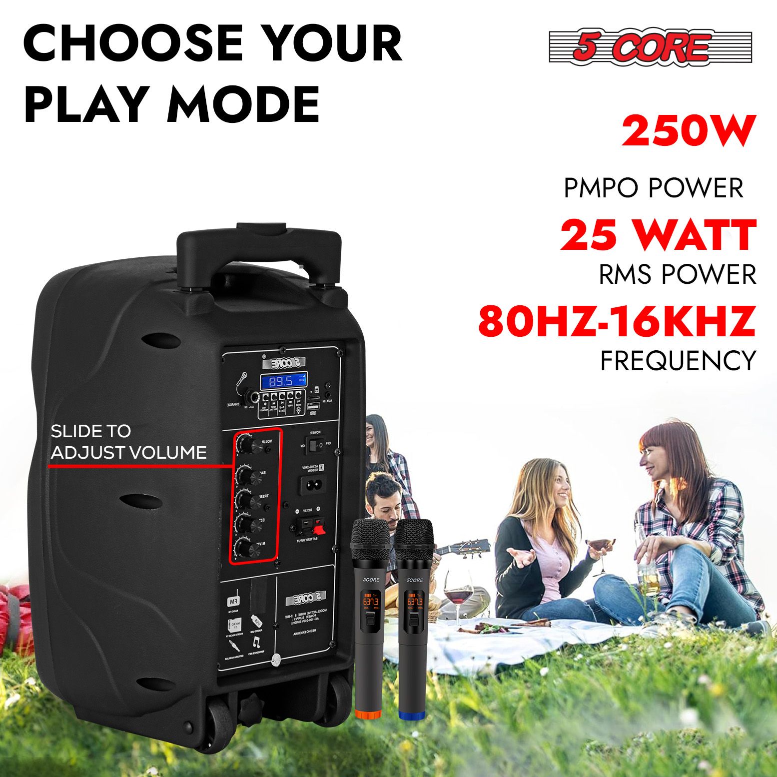Experience powerful sound with the 5 Core DJ PA party speaker, featuring a 10 inch speaker and a frequency range of 70hz -17khz. Delivering an impressive 40W RMS power, a robust 16 Oz magnet, it ensures deep bass and clear highs. The super bullet tweeter enhances audio clarity. Designed for convenience, it includes a retractable handle, wheels, which make it easy to carry. This is a rechargeable DJ speaker with a subwoofer; you do not need an outlet to enjoy high quality music. One single charge will run for 3 to 5 hours. The remote control offers easy operation. The Bluetooth studio speaker system brings professional music to home, outdoors, or karaoke. |