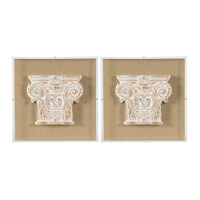 A set of 3-dimensional Corinthian pedestal wall art will add ornate architecture to your home decor. Embellish your traditional homes walls with this washed white set. Place these pieces side-by-side for an eye-catching accent.