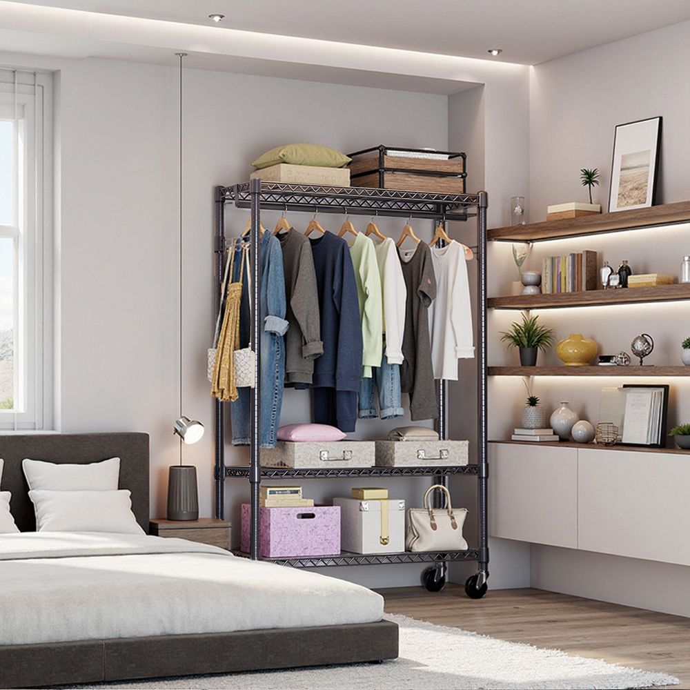4.[Rotatable 360° Wheels And Versatile]: This rolling clothes rack has 4 heavy-duty rolling wheels, and thus you can easily move anywhere you need, such as the showroom entry closet, bathroom, garage, laundry room, hallway, balcony, bedroom, cloakroom, and more. And 2 of them are lockable, which ensures more security