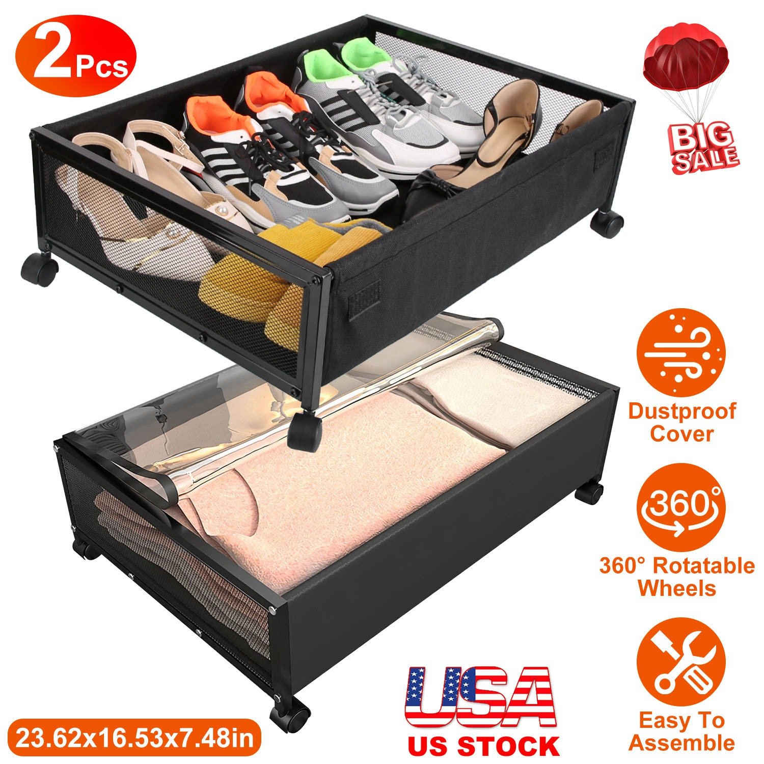 Our storage containers help you to make full use of the space of bed, sofa, closet, you can store books, shoes, seasonal beddings and clothes, keep those less-used items out of sight, make you house look tidy and well-organized. Featured with oxford cloth and mesh side, effectively prevent items from dust, mildew and moisture. Transparent cover and 360° rotatable wheels are convenient for you to quickly access what you need. Ideal assistant for people who feel like the storage space is always insufficient.